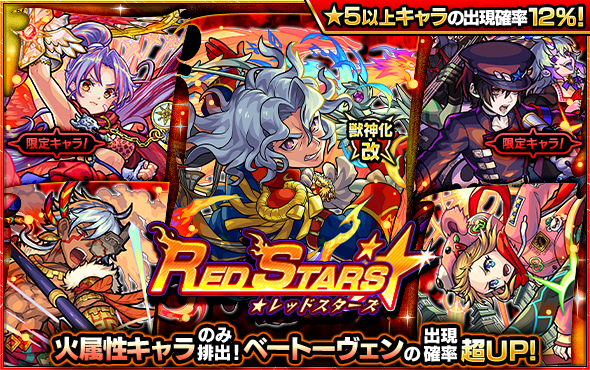 ガチャ「RED STARS」は、「カマエル」「」「マチュ・ピチュ」「アップル」などを含む火属性キャラクターのみ排出!