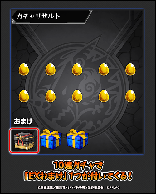 ガチャ「超・獣神祭×『SPY×FAMILY』」で10連ガチャを引くと、「EXおまけ」として「コラボ限定グッジョブ」が、9種類の中からいずれか1種類が付いてきます!