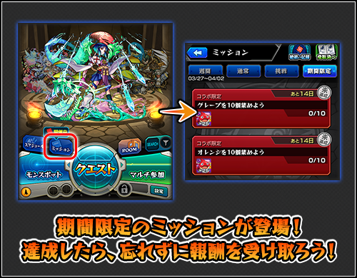 ホーム画面のミッション「期間限定」に、「グレープ」「オレンジ」を集めるミッションが登場!