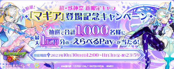 「モンストキャンペーン公式Xアカウント」(旧Twitter)から投稿される、キャンペーン対象のポストをリポストすると、抽選でえらべるPay最大10,000円分が1,000名様に当たるチャンス!