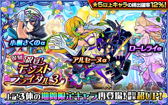 ガチャ「復刻♥祝宴!モンストブライダル3」は、期間限定キャラクター「小桐さくのα」「アルセーヌα」「ローレライα」の3体が再登場!