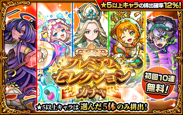 「プレミアムセレクションガチャ」は、★5以上は各属性1体ずつ選んだキャラクターのみが排出対象となる10連ガチャ!選んだ5体のキャラクターの提供割合は各2.4%!
